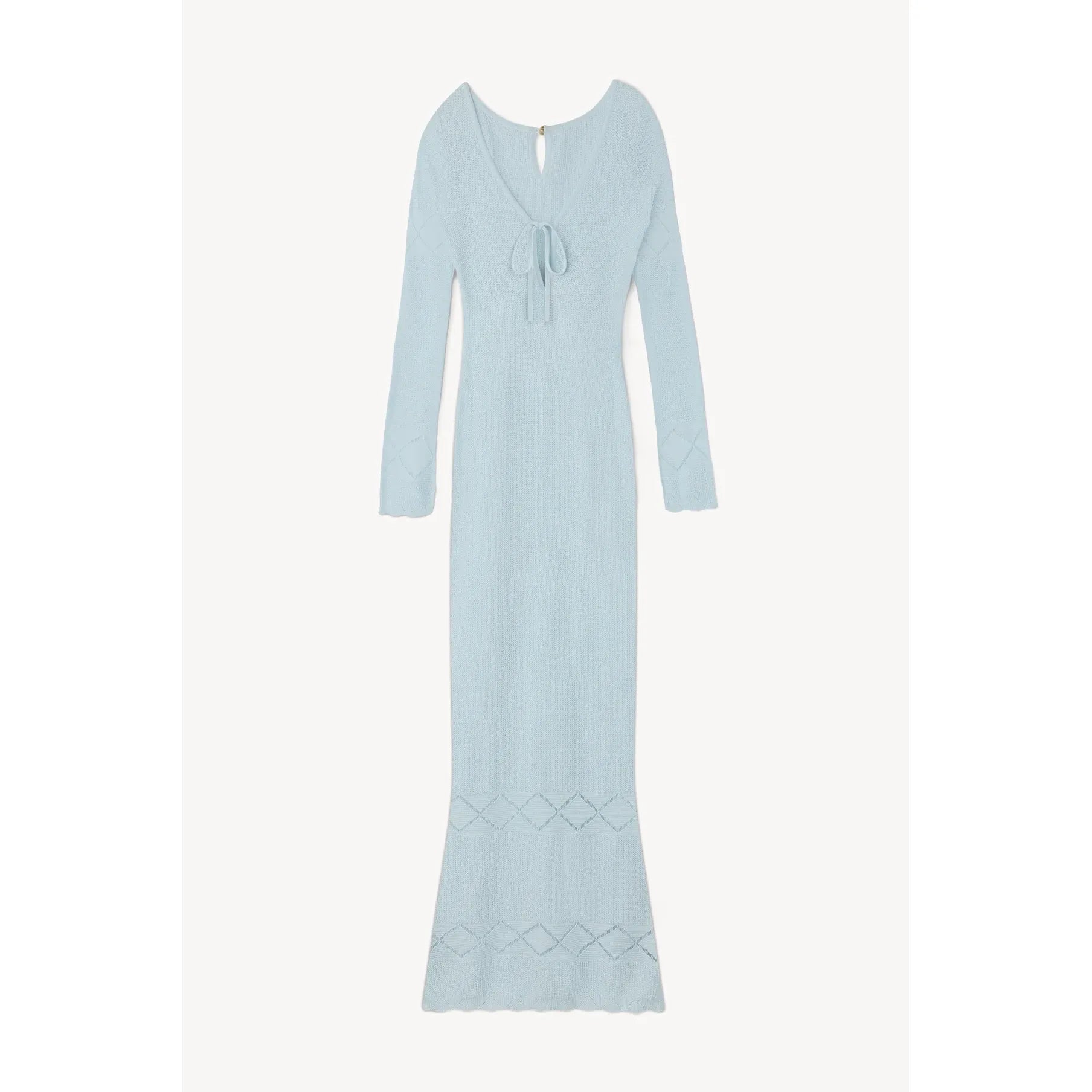 Featuring a deep V-neckline with a delicate tie closure, the dress sculpts the body with its ribbed knit fabric. Long sleeves are finished with intricate pointelle detailing, while the flowing silhouette gently flares out at the hem, creating a flattering and feminine shape.